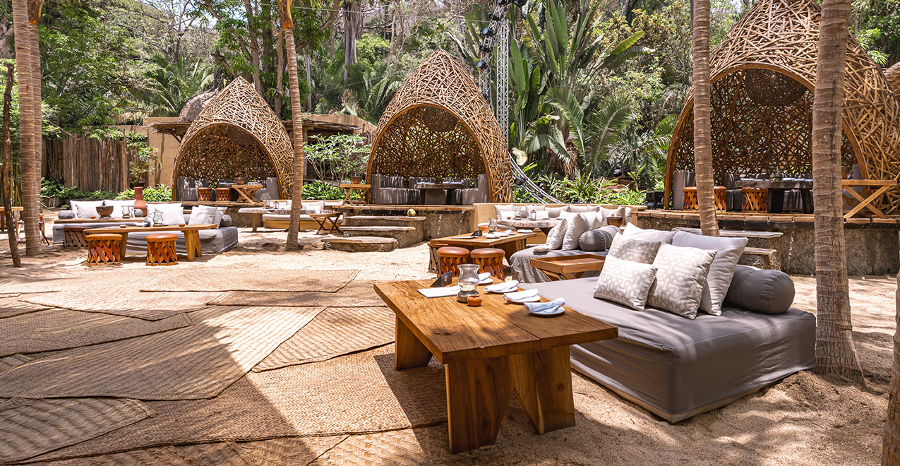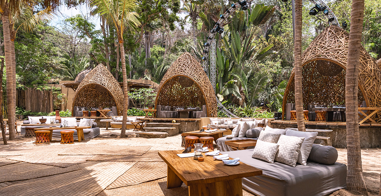 The beachside lair encompasses a sandy beach, open-plan restaurant, and sunset beach for our music rituals.